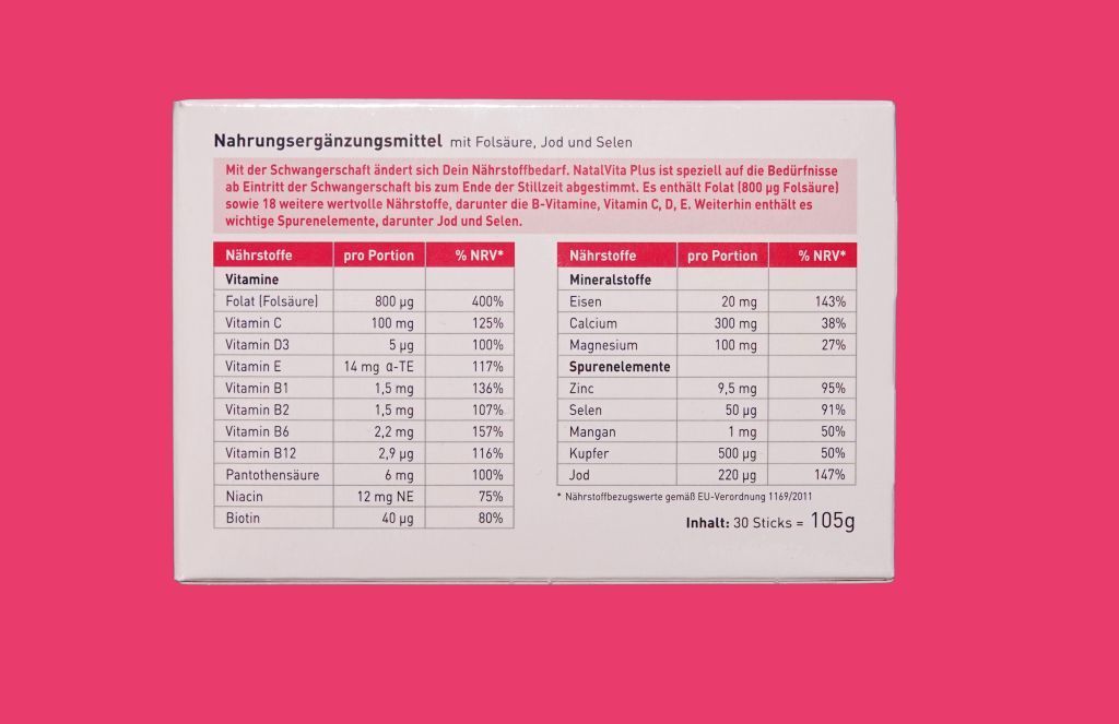 ALWINE NatalVita Plus enthält Folat (800 ug Folsäure) sowie 18 weitere wertvolle Nährstoffe, darunter die B-Vitamine, Vitamin C, D und E.